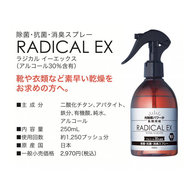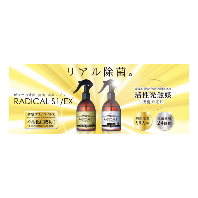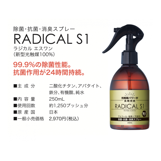 99.9%の除菌性能だけでなく、抗菌作用が長時間つづく。これが真の除菌力です。ラジカルS1は、経済産業省所管の産業技術総合研究所が開発した「活性光触媒」技術を進化させた新世代の除菌・抗菌・消臭スプレーです。 ほとんどのウイルスや細菌を分解除去。24時間以上、抗菌効果を持続します。 さあ、これからは『リアル除菌』の時代。日本のウイルス対策に、ラジカルS1を。(下記URL内の動画を御覧ください。物凄い除菌力です)