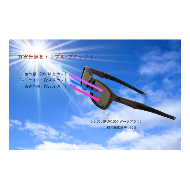 太陽光の中でも紫外線の約5倍の量と言われる近赤外線は、目元の光老化(しわ・たるみ)や白内障などの原因になると言われており、本商品のレンズは紫外線やブルーライトだけでなく、一般のレンズではあまりカットできない近赤外線を約98%カットできるのが大きな特長(=特許取得)となっています。