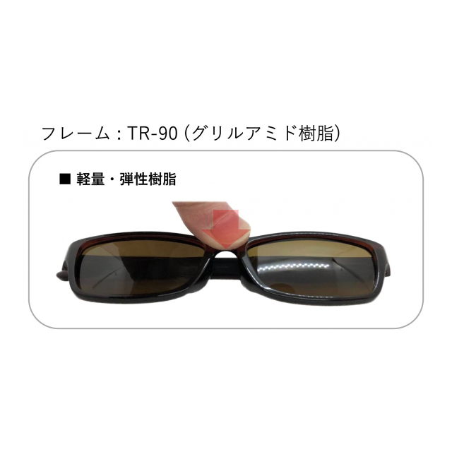 フレームの素材には軽量・弾性樹脂の【 TR-90 】を採用しているため、長時間掛けていても疲れにくく、また耐衝撃性にも優れているため、フレームが破損しにくいという特長もあります。
