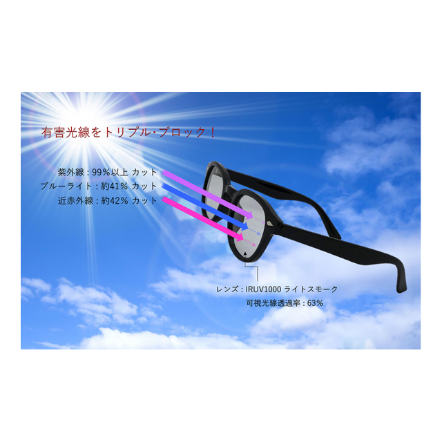 太陽光からは紫外線だけでなく、目の疲れや視力低下の原因とされるブルーライトや、光老化(しわ・たるみ)や白内障等の原因とされる近赤外線も発光しており、本商品のレンズはこれらの有害光線を効果的にカットできるのが大きな特長です。