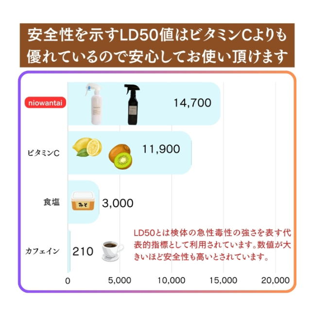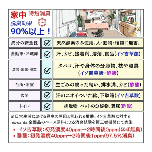 【 ポイント4】niowantaiシリーズ全製品の原料は第三者機関にて安全性、除菌消臭効果を確認しております。※全ての菌やウイルスを除去するわけではありません。