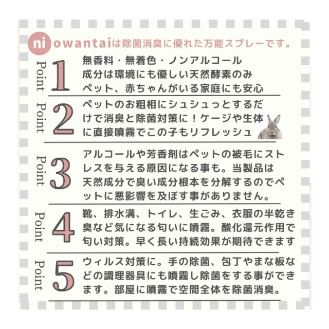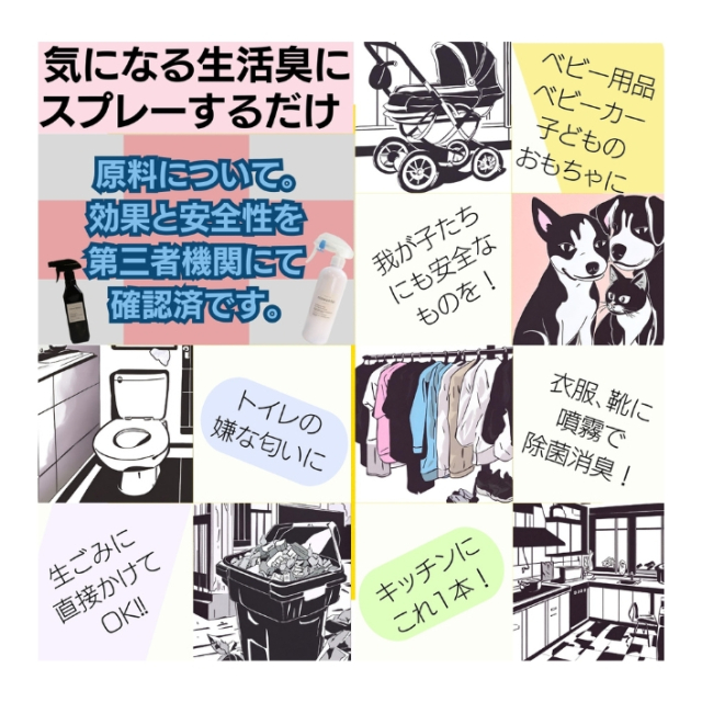 【ポイント3】急な来客時にシュシュッとお家全体に。臭いストレスが軽減されることで日々の生活に少しでも役立つ事ができますと幸いです。