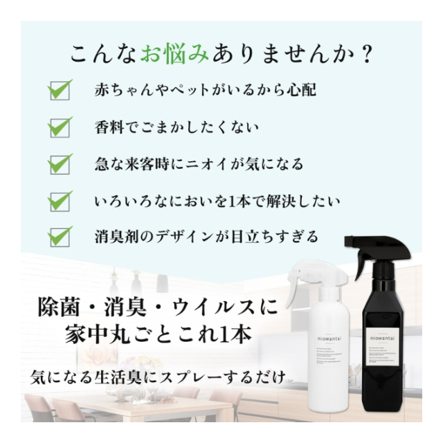 【ポイント3】急な来客時にシュシュッとお家全体に。臭いストレスが軽減されることで日々の生活に少しでも役立つ事ができますと幸いです。
