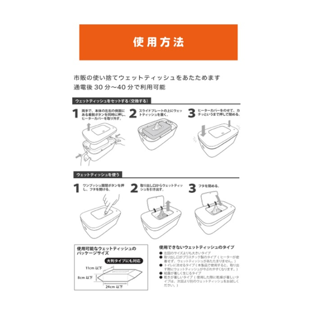 | アルコールを含むウェットティッシュはアルコール揮発の原因となりますので使用しないでください。 取り出し口がプラスチックタイプのものはウェットティッシュが温熱部に触れないので温まりません。 トイレに流せるタイプは破れやすいので使用をお控えください。 結露が多く生じるタイプや、乾燥が著しいタイプは次回より別のウェットティッシュをお試しください。 |