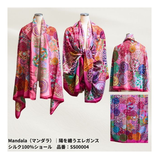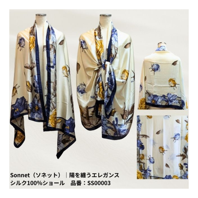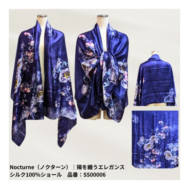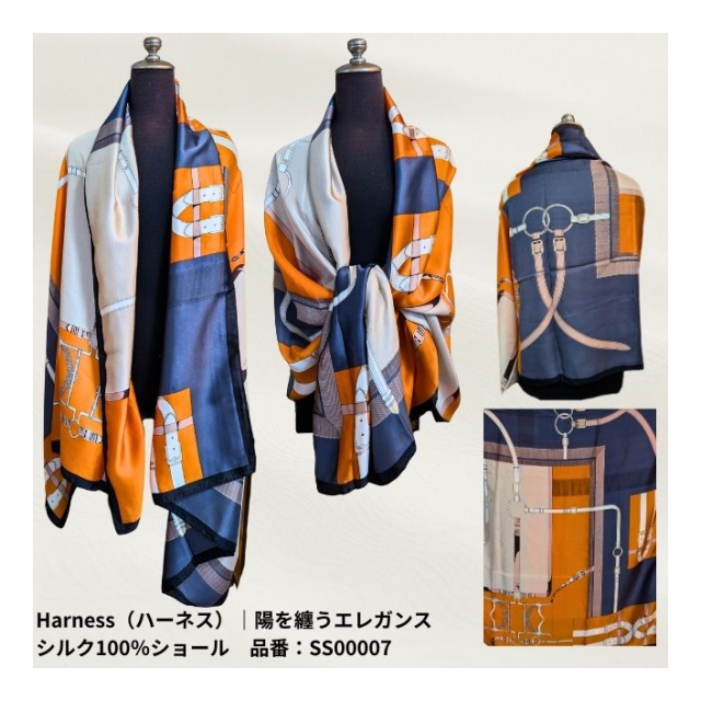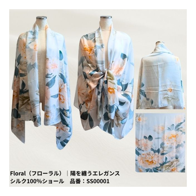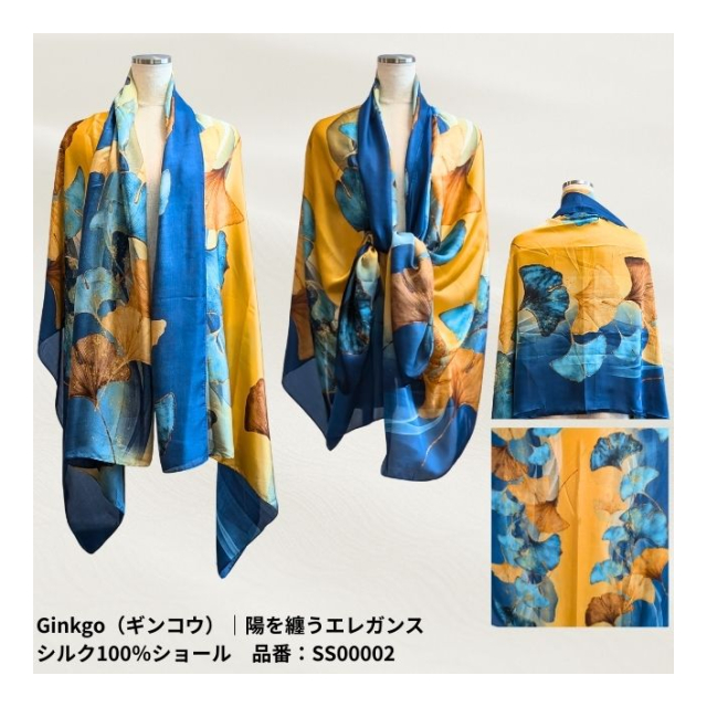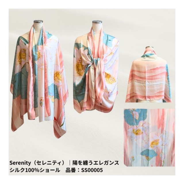 | 陽を纏うエレガンス シルク100%ショール サイズ:長辺 × 短辺 【Floral(フローラル)|品番:SS00001】 179cm × 80.5cm 【Ginkgo(ギンコウ)|品番:SS00002】 179cm × 90cm 【Sonnet(ソネット)|品番:SS00003】 183cm × 84cm 【Mandala(マンダラ)|品番:SS00004】 178cm × 90cm 【Serenity(セレニティ)|品番:SS00005】 184cm × 84.5cm 【Nocturne(ノクターン)|品番:SS00006】 179cm × 79cm 【Harness(ハーネス)|品番:SS00007】 180cm × 80.5cm |