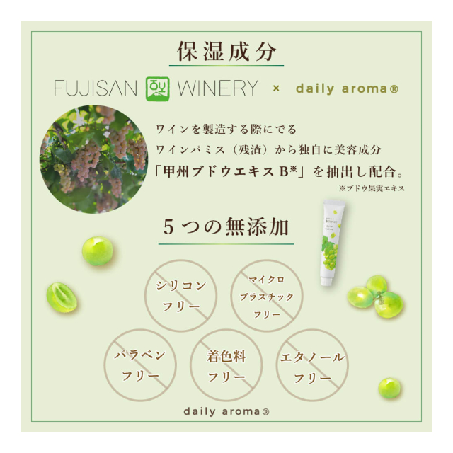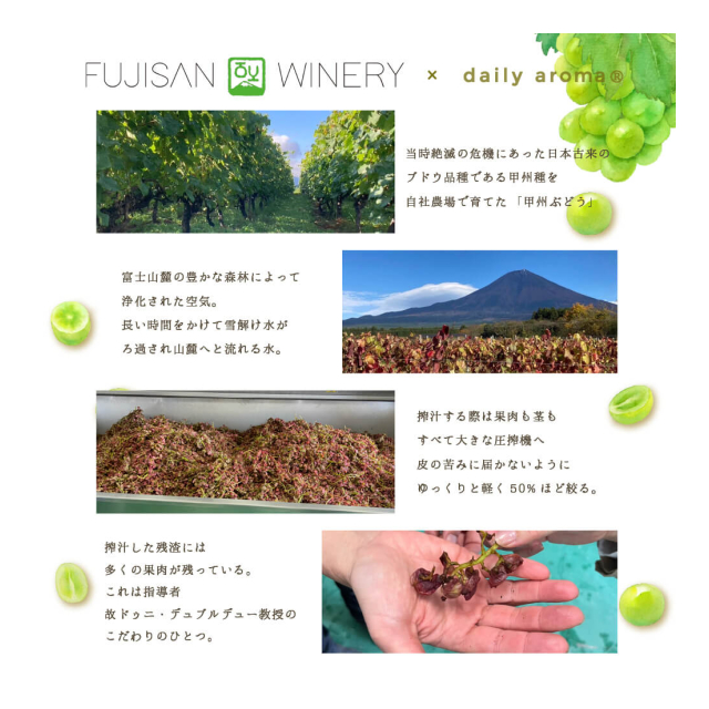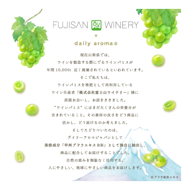 自然豊かなこのワイナリーで育った「甲州ブドウ」からワインを製造する際にでるワインパミス(残渣)から独自に美容成分「甲州ブドウエキス※」を抽出配合。