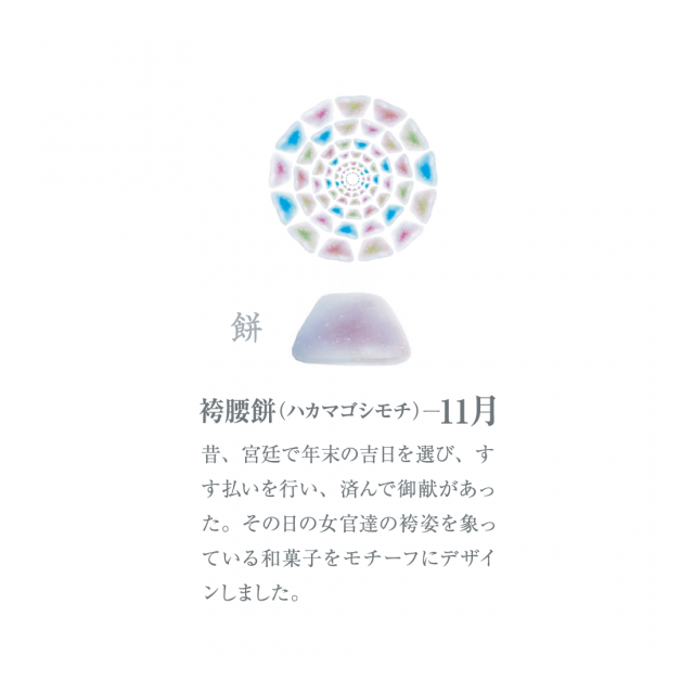 その日の女官たちの袴姿を象っている和菓子をモチーフにデザインしました。