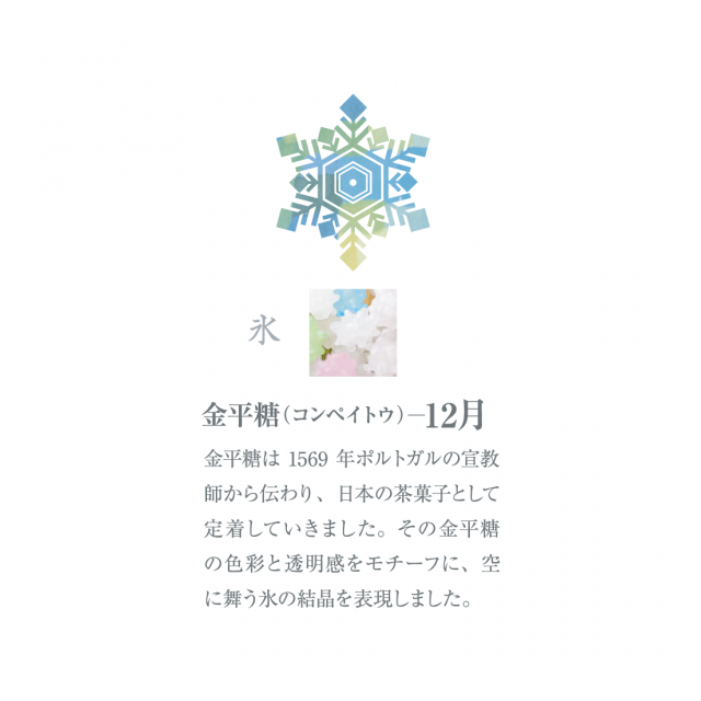 その金平糖の色彩と透明感をモチーフに、空に舞う氷の結晶を表現しました。
