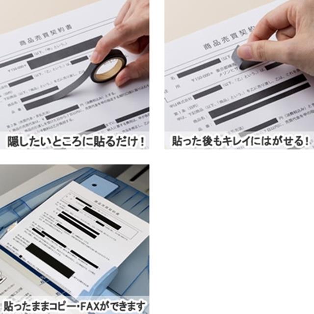 書類などの部分的な目隠しに!好きな長さに切って使える、黒い目隠しテープです。33ポイント程度の大きさの文字がぴったり隠せる12mm幅再剥離タイプなので、きれいにはがせます。紙素材なので、マスキングテープのように手で簡単に切れます。たっぷり使える10m巻き6巻入り。個人情報ののぞき見対策や、コピー、FAXの際の一次的な目隠しに最適です。入数:6個 テープ長さ:10m 素材:上質紙 紙管内径:25.4mm ※書類などの紙にご使用ください。曲面・凹凸面は剥がれる場合があります。※個人情報等の内容を保護することを保証するものではありません。※カーボン紙やインクジェット専用紙にはお使いいただけません。普通紙にインクジェットで印刷した書類はお使いいただけます。