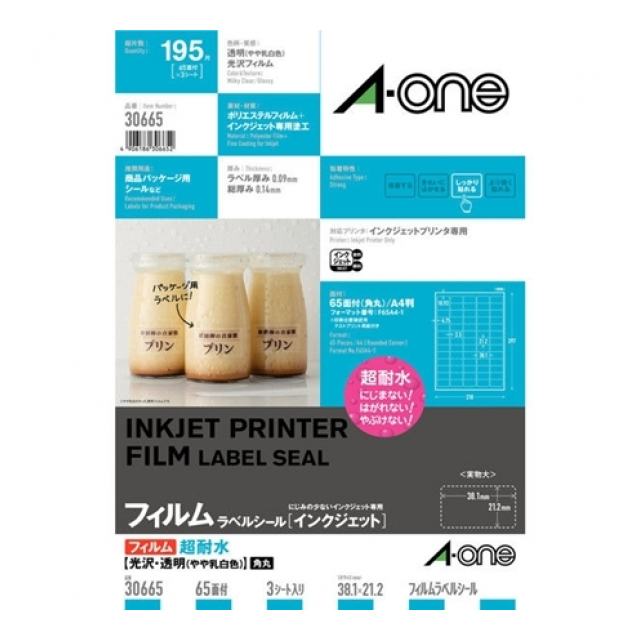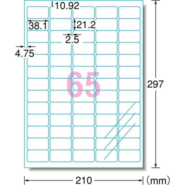 対応プリンタ:インクジェット シートサイズ:A4判(210×297mm) 面付:65面 ラベル厚み:0.09mm ラベル総厚み:0.14mm 材質:ポリエステルフィルム+インクジェット専用塗工 入数:3シート /入数:3シート(195片)シートサイズ:A4判(210×297mm)1片サイズ:38.1×21.2mm面付け:65面 5列×13段厚み:0.14mm