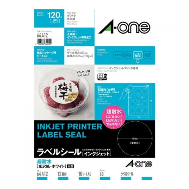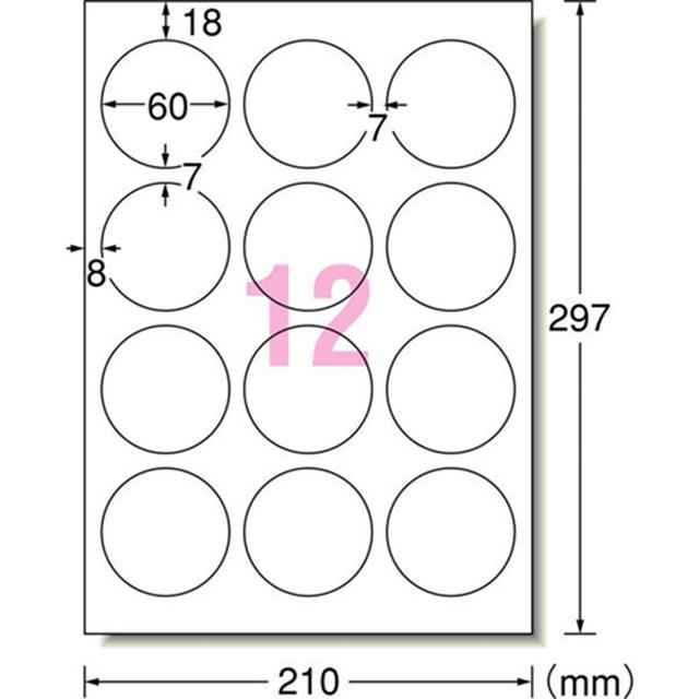 対応プリンタ:インクジェット シートサイズ:A4判(210×297mm) 面付:12面 ラベル厚み:0.11mm ラベル総厚み:0.22mm 材質:合成紙+インクジェット専用塗工 入数:10シート /入数:10シート(120片)シートサイズ:A4判(210×297mm)1片サイズ:60mmφ面付け:12面 3列×4段厚み:193g/m2(0.22mm)
