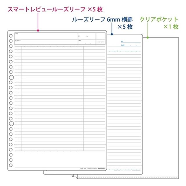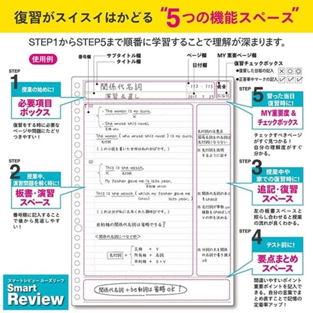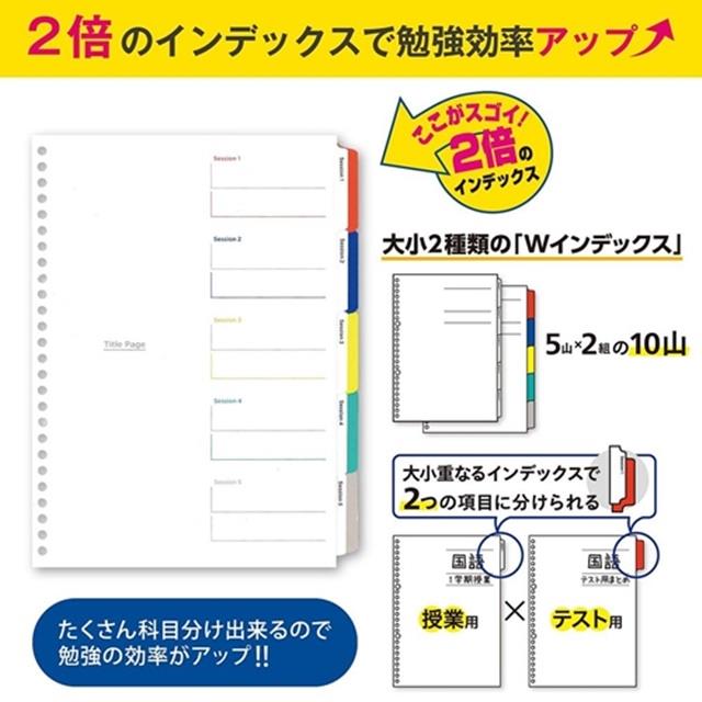 1、大小2種類の「Wインデックス」 たくさん科目分けできるので勉強の効率がアップ2、「スマートレビュー」ルーズリーフ 大事なポイントが覚えやすい「スマートレビュールーズリーフ」5枚と 人気の「6mm横罫ルーズリーフ」5枚の、合わせて10枚のルーズリーフ付きです3、プリントなど持ち運びに便利なクリアポケットリーフ1枚付き プリント類も一緒に収納できるから、テスト前に困りません