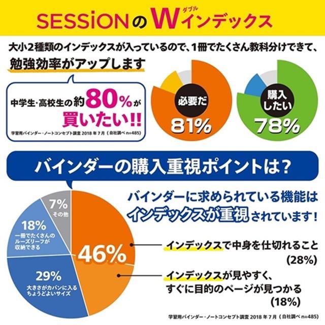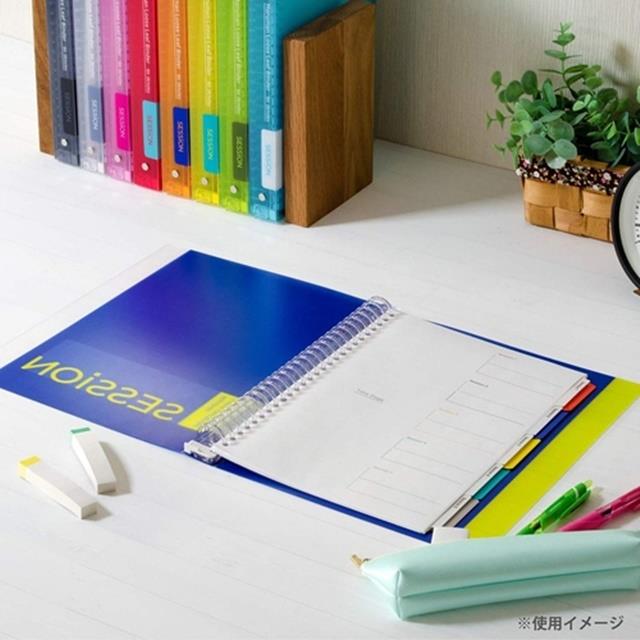 カラーバインダー「SESSiON」は、2倍のインデックスで勉強効率がUP!教科、項目分けに必要なカラーラミネートタブ5山はそのままに、個人個人で異なる様々な用途に対応できるようにフリータブを追加した、Wインデックスが特長です。人気が高い爽やかな6色に、初回限定の3色(グリーン・オレンジ・グレー)を加えた選べる9色展開!丈夫で軽いバインダー表紙、書きやすいルーズリーフなどさまざまなシーンで心地よく使える Made in JAPAN の高い品質を提供します。