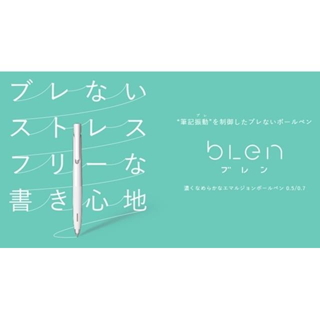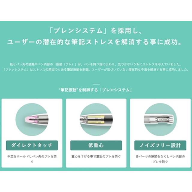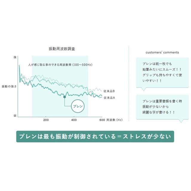 “筆記振動ブレ”を制御したブレないボールペン。紙とペン先の接触やペン内部の「振動(ブレ)」が、ペンを持つ指に伝わり、気づかないうちにストレスを与えていました。「ブレンシステム」はストレスの原因でもある筆記振動を制御。ユーザーが気づいていない潜在的な不満を解消する事に成功しました。濃くなめらかなエマルジョンボールペン。