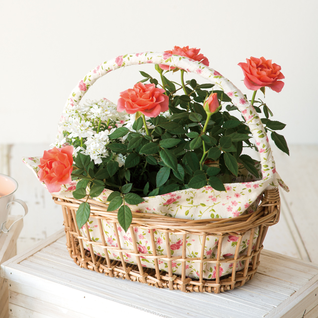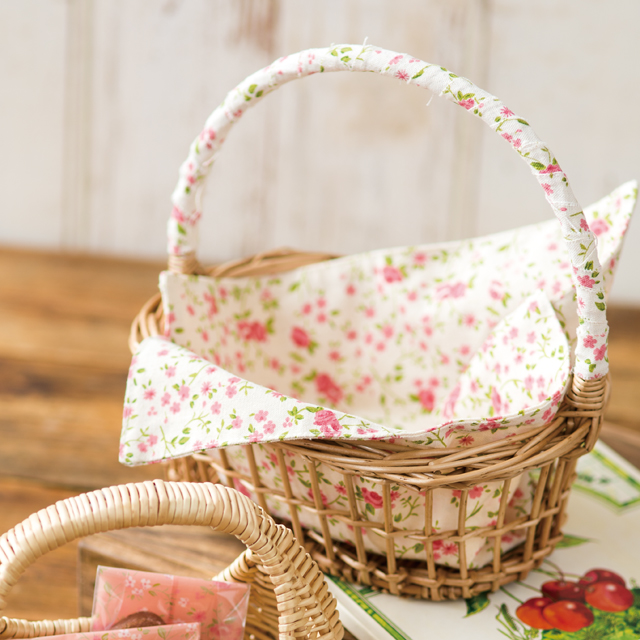 ちょっぴり乙女なフラワーバスケット。リトルフラワーがプリントされたクロスとハンドルがかわいいバスケットです。