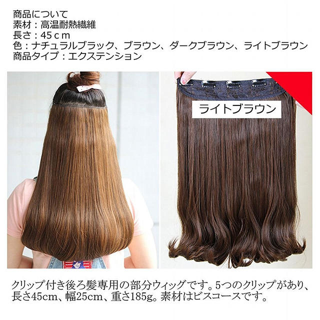 | 高級耐熱繊維 部分ウィッグ 毛質:高級耐熱繊維 商品タイプ:エクステンション 長さ:45cm 毛量:190g ロングヘアにあこがれている方必見。部分ウィッグで簡単にロングヘアになれます。 |