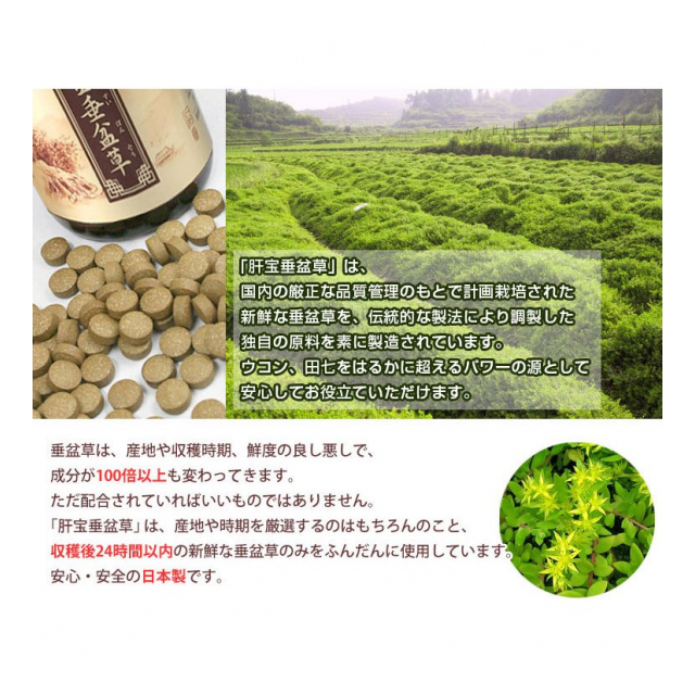 主原料となる垂盆草は、日本企業の厳正な品質管理下で計画栽培されたものを用いています。また、伝統的な製法により抽出されたエキスを素に製造することで、肝臓病などに処方されるお薬と併用しても安心な商品に仕上げています。