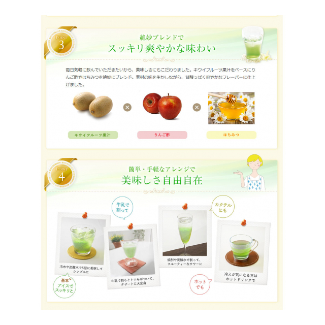甘酸っぱく飽きのこない美味しさにこだわった、キウイフルーツ味の酢飲料です。