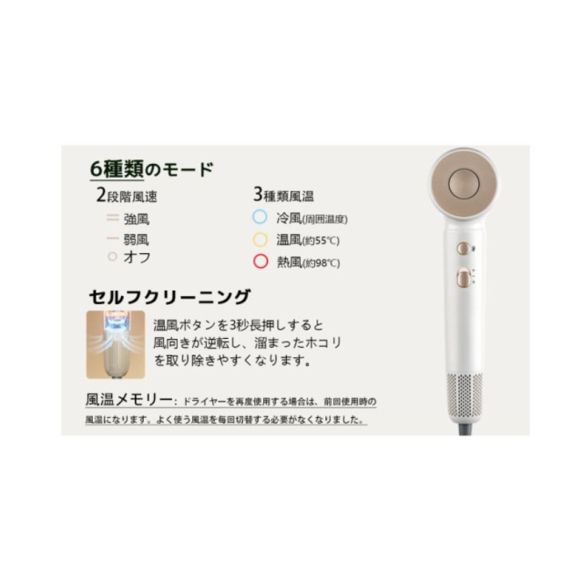 | 高風速:21m/s 回転速度:11万回転/分 速乾:ショートヘア 1分 | ミディアムヘア 3~5分 | ロングヘア 8~10分 髪を乾かす時間が短縮され、より多くの時間を節約できます。 冷風:約30℃(周囲温度) 温風:約55℃ 熱風:約98℃ |