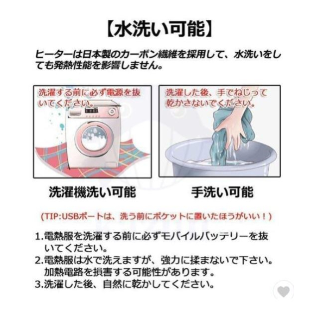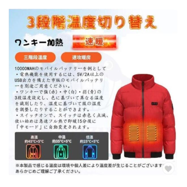 10000MAHのモバイルバッテリ一を例として?電熱機能を使用するには、5V/2A以上の USB出力を備えた市?のモバイルバッテリ一を別途ご用意くだきい。