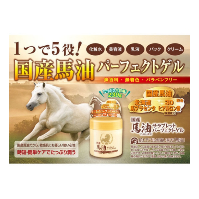 ●天然成分の中で人間の皮脂に最も近いとされる「馬油」を主原料とし、「国産馬プラセンタ・3Dヒアルロン酸」を配合しています。