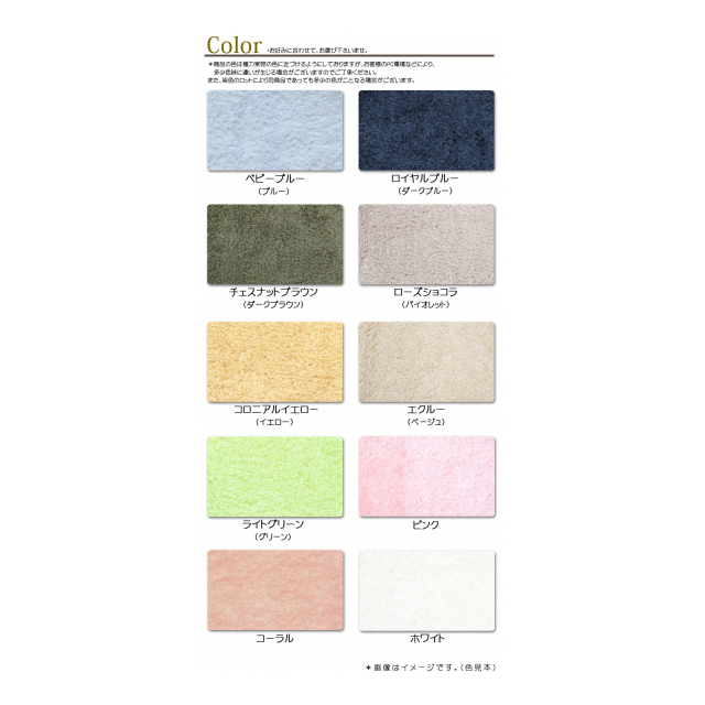 | ご注文単位での簡易包装となります。一枚単位での個包装は行っておりません。 3営業日以内の出荷となります。 パイルに撚りのない「無撚糸」を使用しています。 毛羽落ちの多い商品ですのでご了承ください。 ●最初のお洗濯は、多めの水量で水だけでお洗いください。 柔軟剤を使用せずにお洗濯していただき、繰り返しお洗濯をされて 硬くなってきたように感じられましたら、少しだけ柔軟剤をご使用ください。 ●色物は必ず別々にお洗いください。 ●タオルを干される際は、風通しの良い日陰で干されますと、 ふんわりとした風合いに仕上がります。 |