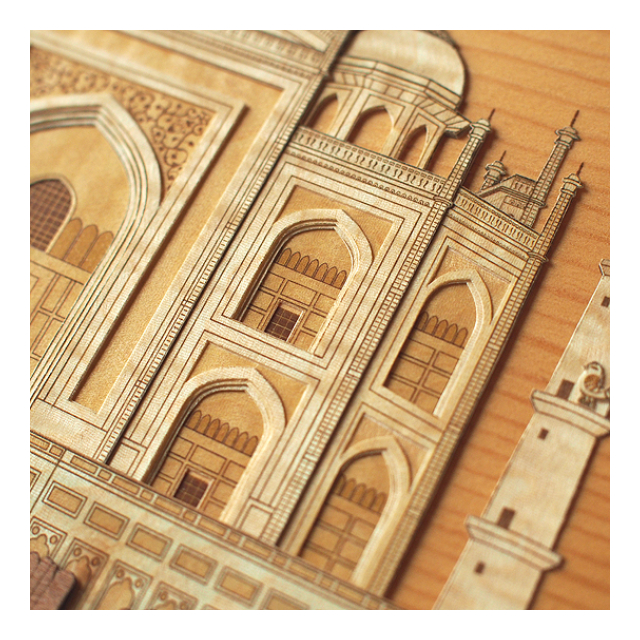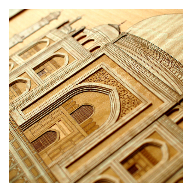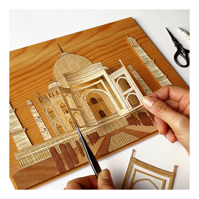 ペーパークラフト感覚で、カッターとボンドさえあれば気軽にできるハンドメイドの木工アートです。
