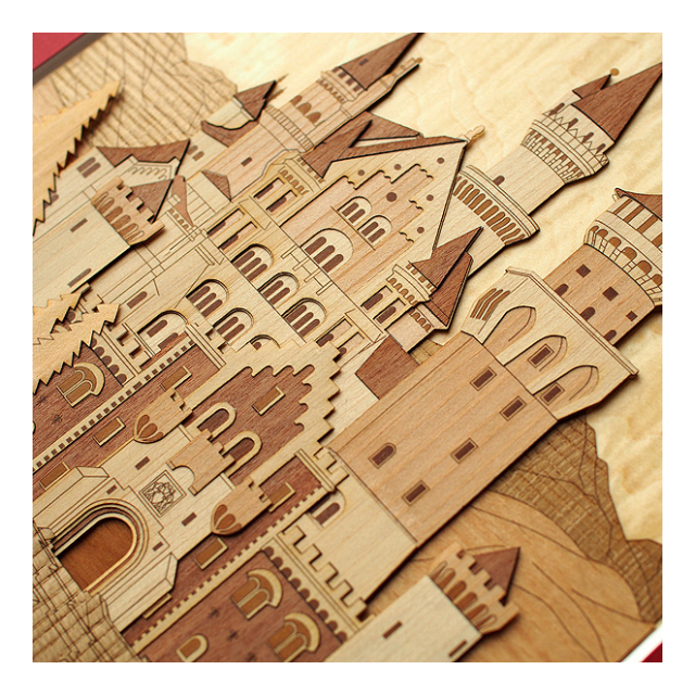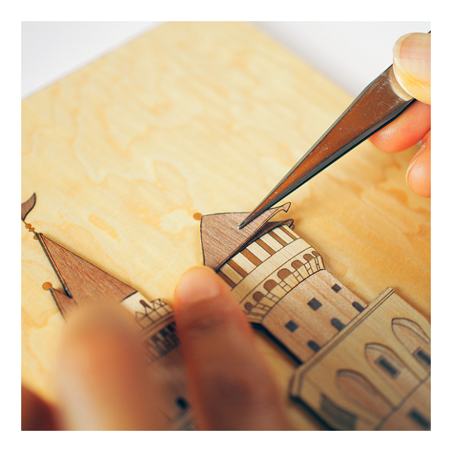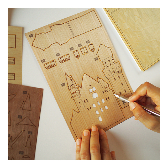 ペーパークラフト感覚で、カッターとボンドさえあれば気軽にできるハンドメイドの木工アートです。