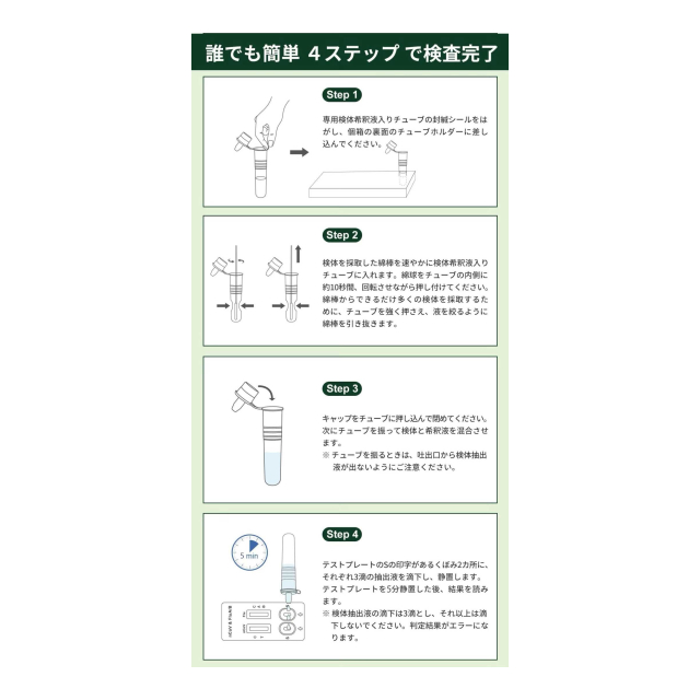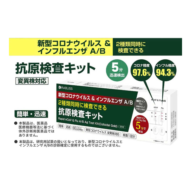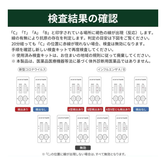[この商品について]本件抗原検査キットは、疫学調査等のための試験研究を目的とするものであり、疾病等の診断を行うことを目的とするものではないため、新型コロナ感染症の罹患の有無を調べる目的で使用すべき商品ではありません。 発熱等の症状がある方で、新型コロナ感染症の罹患が疑われる場合には、受診相談センター又は医療機関にご相談ください。 発熱等の症状が無い方が、新型コロナ感染症に関する検査の受検を希望する場合には、自己負担で受ける検査(自費検査)を提供する医療機関を受診するか、提携医療機関を有する自費検査を提供する機関において新型コロナ感染症に関する検査を受検してください。