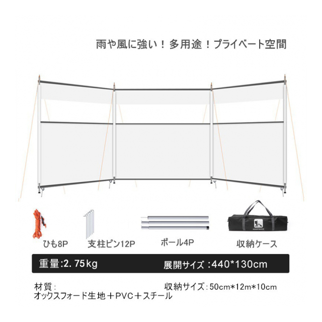 | 材質:オックスフォード生地+PVC+スチール サイズ:440cm*130cm 包装:専用ケース(50cm*12m*10cm) 重量:約2.75kg(ケース含む) 色:ブラック・レッド・ベージュ |