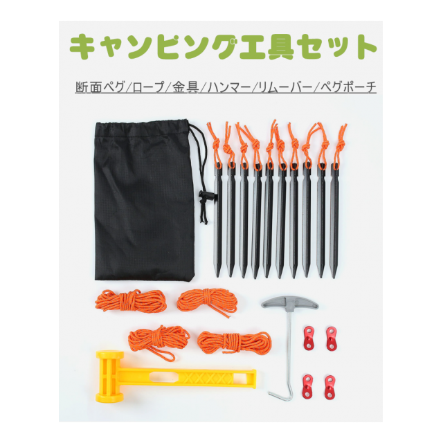 セット内容:ペグ10P、ロープ4P(厚さ4mm/長さ4m)、自在金具4P、ペグハンマー、ペグリムーバー、ペグポーチ