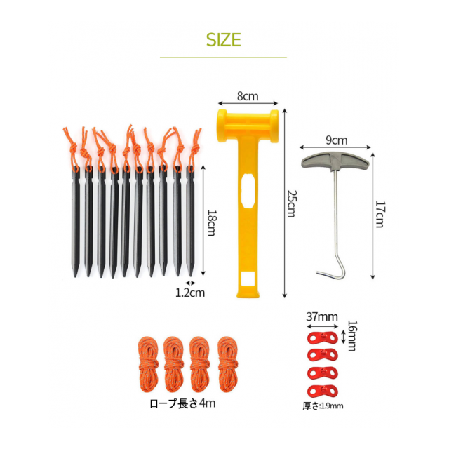 | 商品素材:ペグ:7001アルミニウム合金、ロープ:ポリエステル、自在キング:アルミニウム、ハンマー:PP、リムーバー:スチール+PP 包装方法:OPP サイズ:ペグ:18cm×1.2cm 重量:約335g |