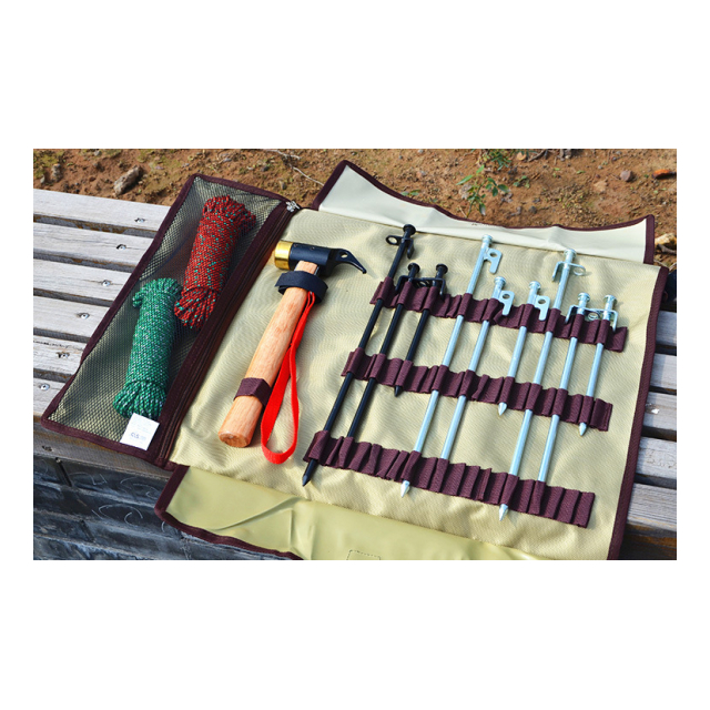 テントやタープ設営に必要な、ペグ、ハンマー、ロープを一つのバックに