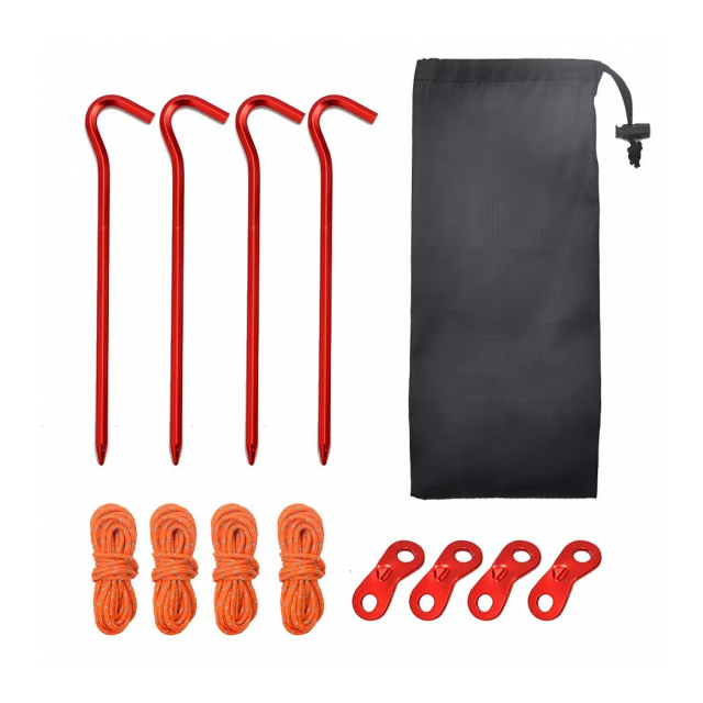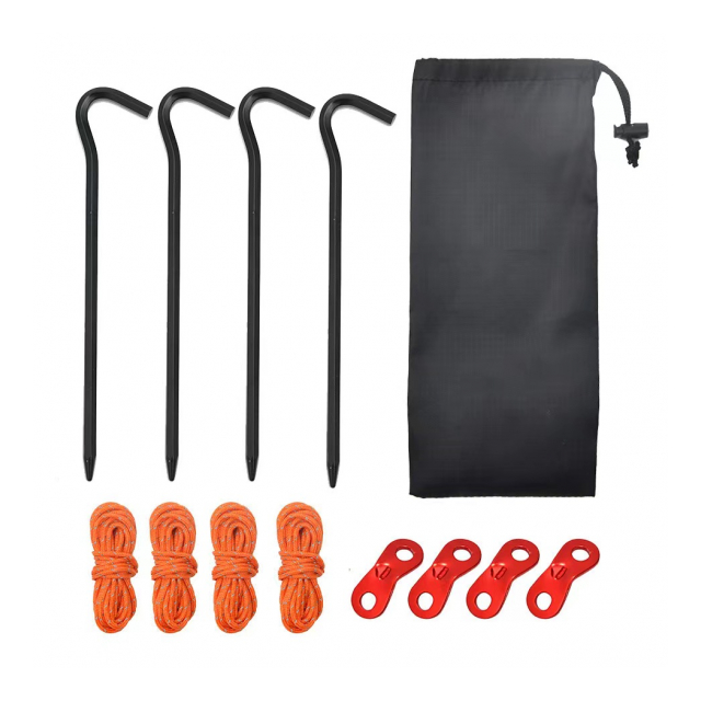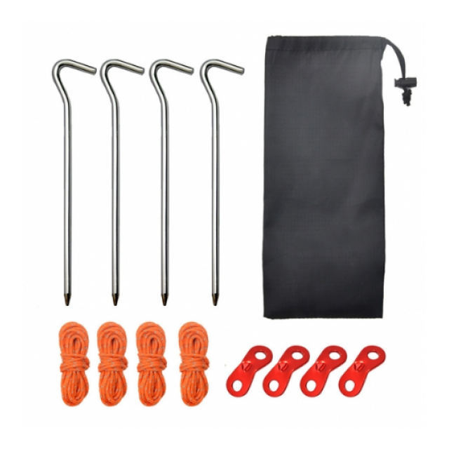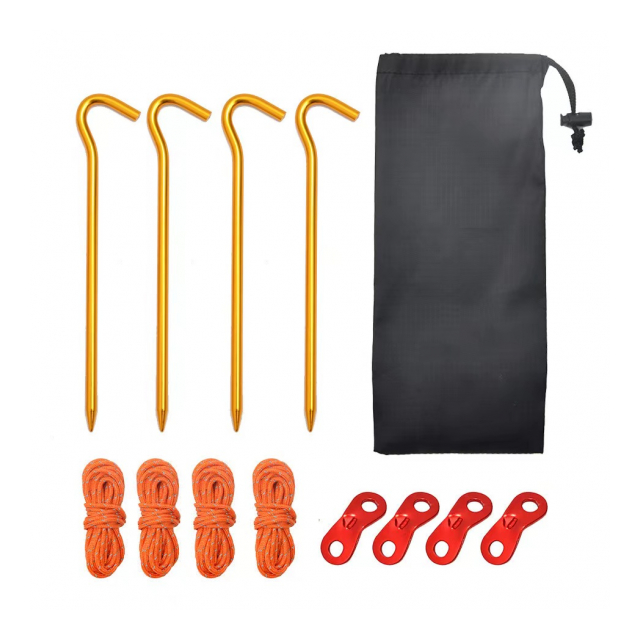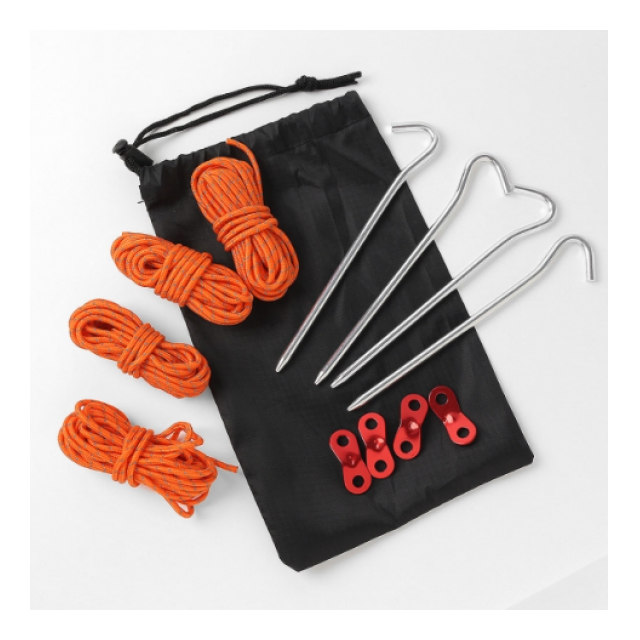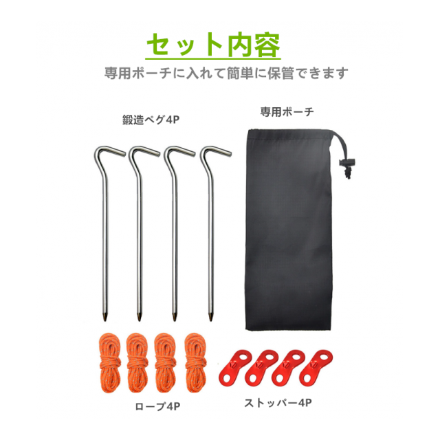 セット内容:鍛造ペグ4P、ロープ4P(厚さ4mm/長さ4m)、自在金具4P、専用ポーチ