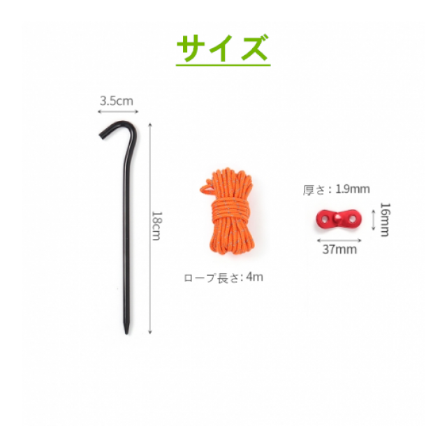 | 商品素材:ペグ:7001アルミニウム合金、ロープ:ポリエステル、自在キング:アルミニウム、 包装方法:OPP サイズ:ペグ:18cm×3.5cm 重量:約170g |