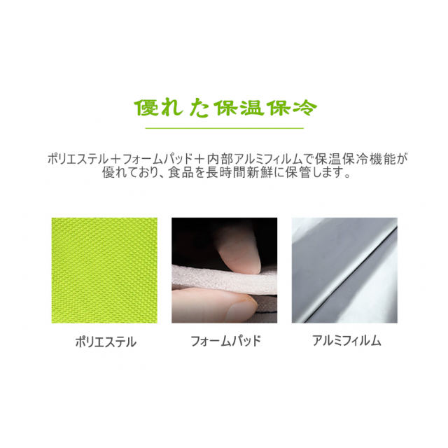 ポリエステル+フォームパッド+内部アルミフィルムで保温保冷機能が