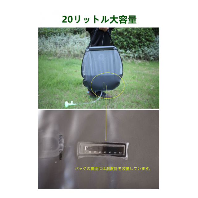 20Lの容量があり、キャンプやアウトドアイベントでシャワーを浴びるだけでなく、水が必要な場合も1つのシャワーバッグですべてを清潔に解決できます。