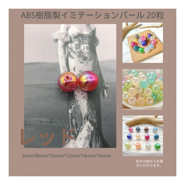 | 材質:ABS樹脂 サイズ:6mm/8mm/10mm/12mm/14mm/16mm 色:18色 梱包:20粒/袋 |