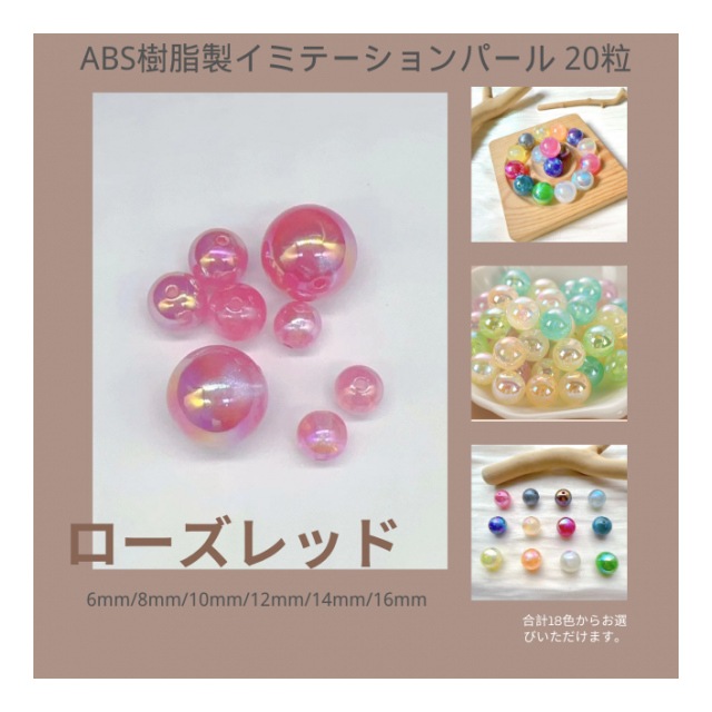| 材質:ABS樹脂 サイズ:6mm/8mm/10mm/12mm/14mm/16mm 色:18色 梱包:20粒/袋 |