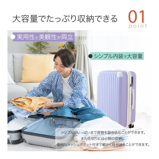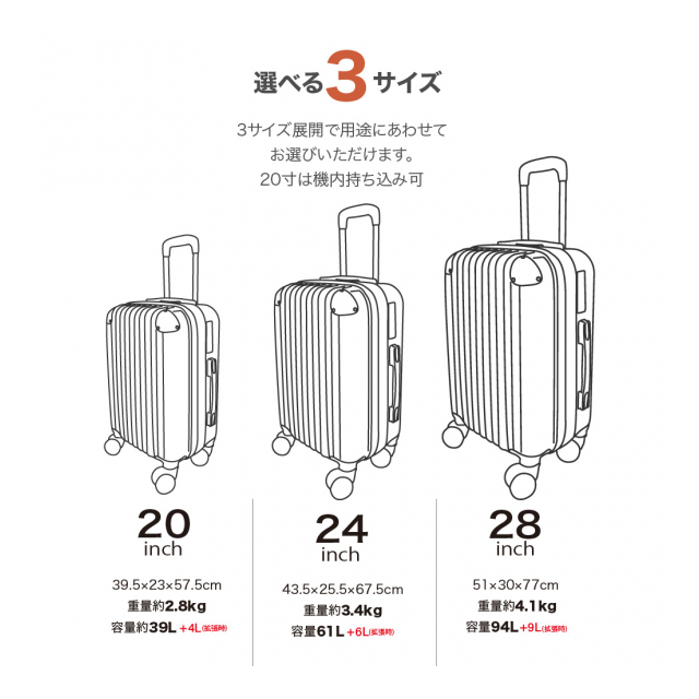 | 3点セット入り Sサイズ(39L):39.5*23*57.5cm Mサイズ(61L):43.5*25.5*67.5cm Lサイズ(94L):51*30*77cm |
