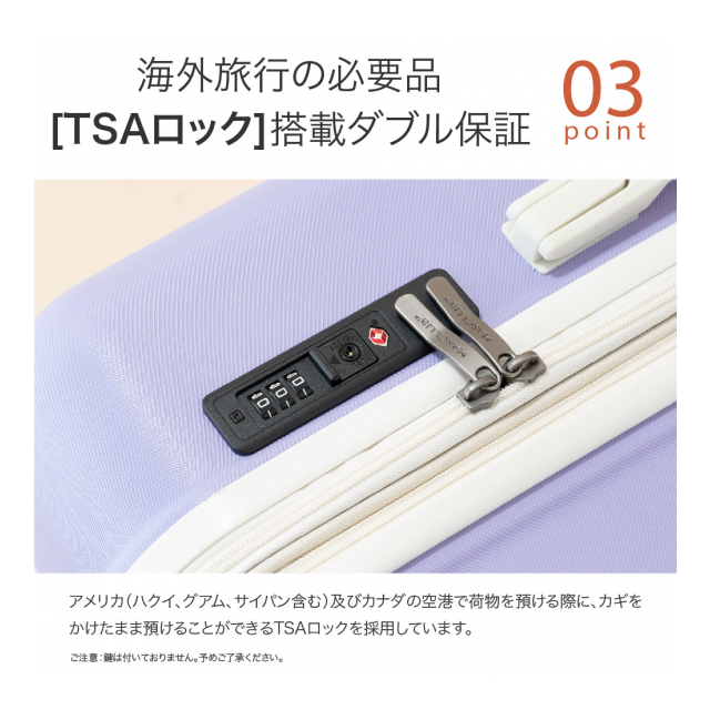 | ●シンナー・ベンジン・有機溶剤系のクリーナーは使用しないでください。変形、変色、それによる機能低下(場合により使用不可能な状態)が発生する事も考えられますのでご注意下さい。 ●製品の表面の汚れは、水や中性洗剤を柔らかい布に含ませ、かたく絞ってから拭き取って下さい。 ●保管の際は直射日光を避け、通気性の良い場所で保管ください。湿気などにより、カビが生じる場合がございますのでご注意下さい。 ●航空会社に預けた荷物が運送中に破損が確認された場合は、お手荷物受領後、速やかにご利用航空会社係員にご相談下さい。(規約に関しては航空会社により異なりますのでお客様の方でお確かめ下さい。) ●修理のご相談については、お買い上げいただいた販売店へご連絡下さい。 ●TSA(アメリカ運輸保安局)で認められたロックを使用しているケースは、全米の各空港に配属されているTSA職員が特殊ツールを使用して、開錠・施錠する事が出来ますので、荷物に鍵をかけたまま検査に出す事が可能です。検査はロックを破壊する事無くすみやかに行われ、検査後は施錠して戻してくれます。 ●鍵の開閉をする時は可動範囲内(開錠~施錠のマーキング位置-90°)で行って下さい。回しすぎるとキーやTSAロック本体にダメージを与える恐れがあります。 ●鍵の開閉をする時はキーをしっかりと差し込んで軽く回してください。回転が硬い場合または差し込みが不十分な状態で回すと、キーやTSAロック本体の破損に繋がる場合があります。回転が硬い場合は再度キーを差し直して下さい。 ●鍵をロックする際は確実に左右内側の金具(フック)が止まっているか確認して下さい。移動中に本体が開いて、中の荷物が飛び出す恐れがあります。 |