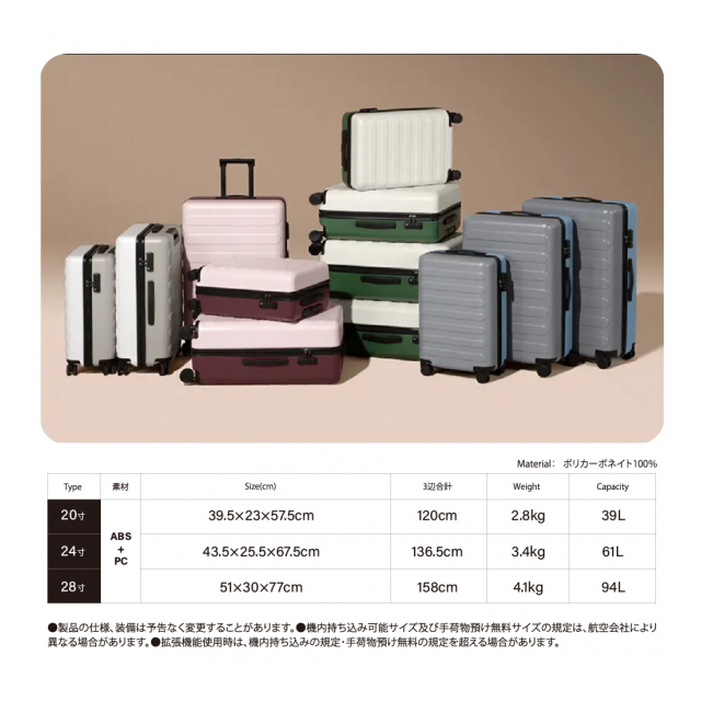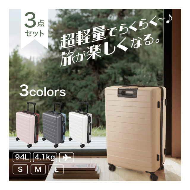 | 3点セット入り Sサイズ(39L):39.5*23*57.5cm Mサイズ(61L):43.5*25.5*67.5cm Lサイズ(94L):51*30*77cm |