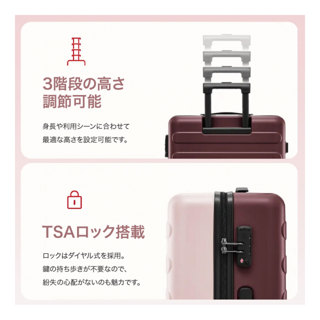 | ●シンナー・ベンジン・有機溶剤系のクリーナーは使用しないでください。変形、変色、それによる機能低下(場合により使用不可能な状態)が発生する事も考えられますのでご注意下さい。 ●製品の表面の汚れは、水や中性洗剤を柔らかい布に含ませ、かたく絞ってから拭き取って下さい。 ●保管の際は直射日光を避け、通気性の良い場所で保管ください。湿気などにより、カビが生じる場合がございますのでご注意下さい。 ●航空会社に預けた荷物が運送中に破損が確認された場合は、お手荷物受領後、速やかにご利用航空会社係員にご相談下さい。(規約に関しては航空会社により異なりますのでお客様の方でお確かめ下さい。) ●修理のご相談については、お買い上げいただいた販売店へご連絡下さい。 ●TSA(アメリカ運輸保安局)で認められたロックを使用しているケースは、全米の各空港に配属されているTSA職員が特殊ツールを使用して、開錠・施錠する事が出来ますので、荷物に鍵をかけたまま検査に出す事が可能です。検査はロックを破壊する事無くすみやかに行われ、検査後は施錠して戻してくれます。 ●鍵の開閉をする時は可動範囲内(開錠~施錠のマーキング位置-90°)で行って下さい。回しすぎるとキーやTSAロック本体にダメージを与える恐れがあります。 ●鍵の開閉をする時はキーをしっかりと差し込んで軽く回してください。回転が硬い場合または差し込みが不十分な状態で回すと、キーやTSAロック本体の破損に繋がる場合があります。回転が硬い場合は再度キーを差し直して下さい。 ●鍵をロックする際は確実に左右内側の金具(フック)が止まっているか確認して下さい。移動中に本体が開いて、中の荷物が飛び出す恐れがあります。 |