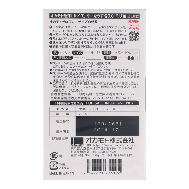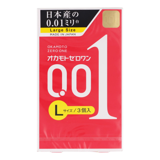 オカモト ゼロワン Lサイズ(0.01 001)/コンドーム/( 避妊具 )/【発売元、製造元、輸入元又は販売元】オカモト/【オカモト ゼロワン Lサイズの商品詳細】●うすさ均一な0.01ミリ台のコンドーム(メーカー測定による)●潤滑剤:スタンダードタイプ●ゴム特有の臭いが全くありません。●天然ゴムラテックスアレルギーの方も安心してご使用いただけます。●熱が伝わりやすい素材のために、ぬくもりを感じられます。●装着時に便利な表裏判別表示付き個包装です。●この製品は本シリーズのレギュラー品に比べてサイズを太くしております。ご使用の際には脱落にご注意ください。/cate20265