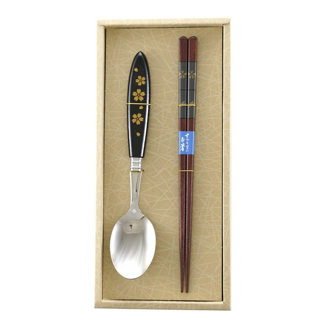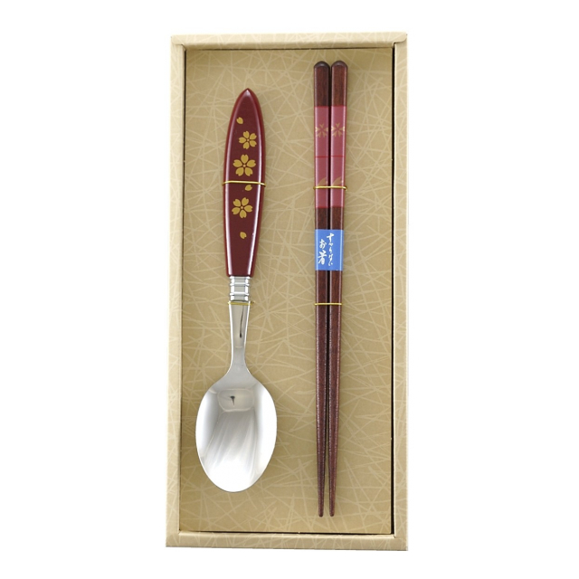 | スプーン素地:木製ハンドル(うるし塗り)、ステンレス製スプーン 箸素地:天然木 箸表面塗装:ウレタン塗装(箸先すべり止め加工) |