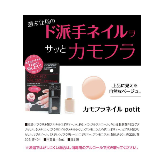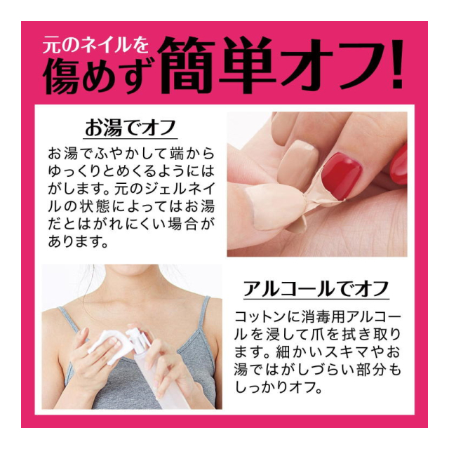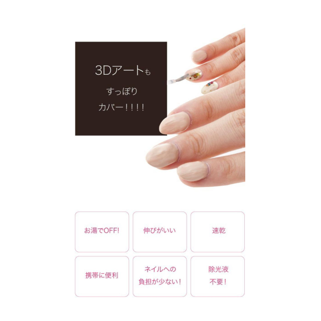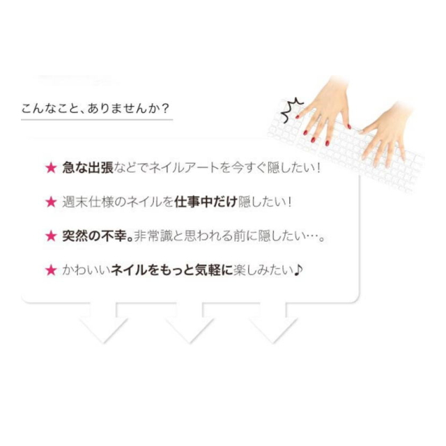 ジェルネイルを一日だけ隠したい時にご使用ください。特に急な出張や冠婚葬祭,フォーマルな場面の間際にご使用頂き、いつでもどこでも直ぐにジェルネイル等を隠す事ができます。また、爪の下にあるジェルネイル等に傷をつける事なく、剥がす事ができます。