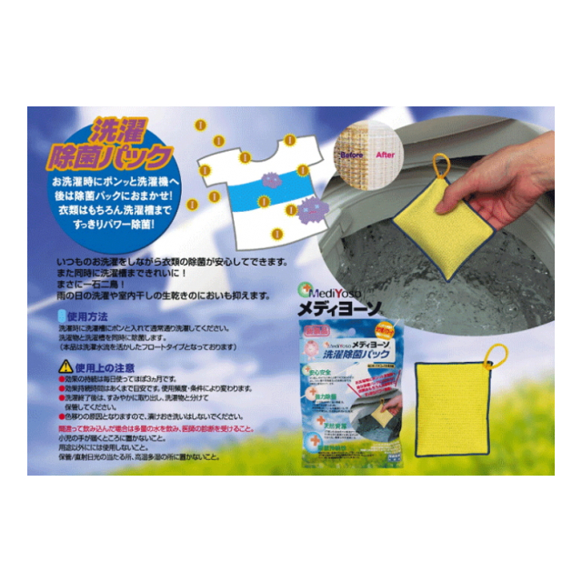 ヨウ素パワーで安心除菌!雨の日の部屋干し、生乾きの臭いが全く気にならない。ヨウ素はそもそも人体に必要不可欠なものです。うがい薬や腹痛薬などの医療分野でも日常的に使用されています。第1の特徴は、非常に強い殺菌力。カビ菌や水虫菌をはじめ、大腸菌O-157やレジオネラ菌などの除菌除去作用があります。また、病院での手術の際の殺菌に使用されていることからもわかるとおり、非常に安全で、殺菌持続時間も長く長く継続します。お洗濯時にポンッと洗濯機へ。あとは除菌パックにおまかせ!衣類はもちろん洗濯槽まですっきりパワー除菌します。