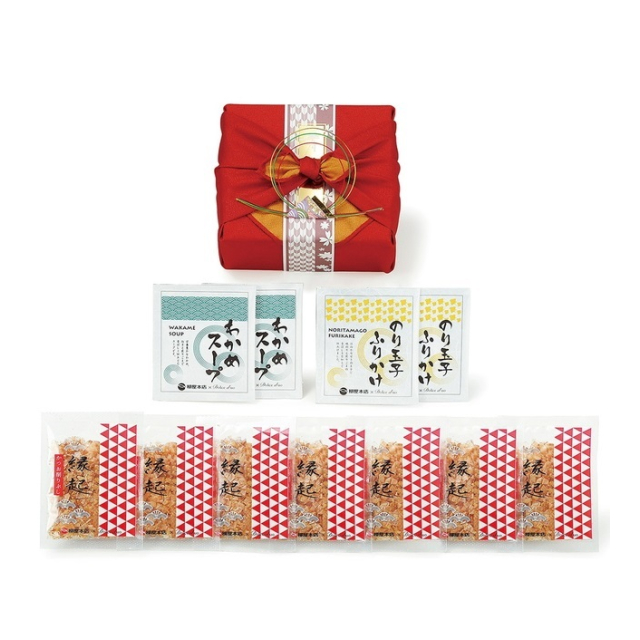 *かつお節/2g×7袋 *のりたまごふりかけ/4.5g×2袋 *わかめスープ/5.3g×2袋 *風呂敷/1枚(約49.5×49.5cm)*box size/(約)16.5×14.5×h9cm *賞味期限/365日〔小麦・卵・乳・えび〕