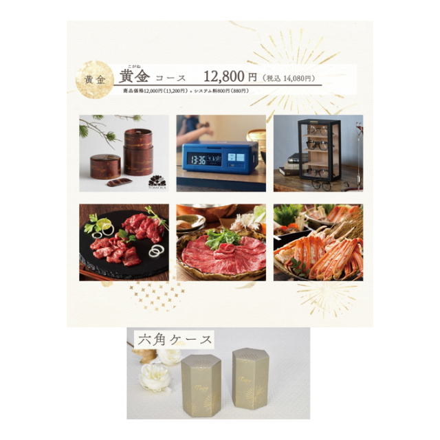 【六角ケース】存在感のある立体型ケース。金箔と亀甲の六角で縁起のよさを表しています。