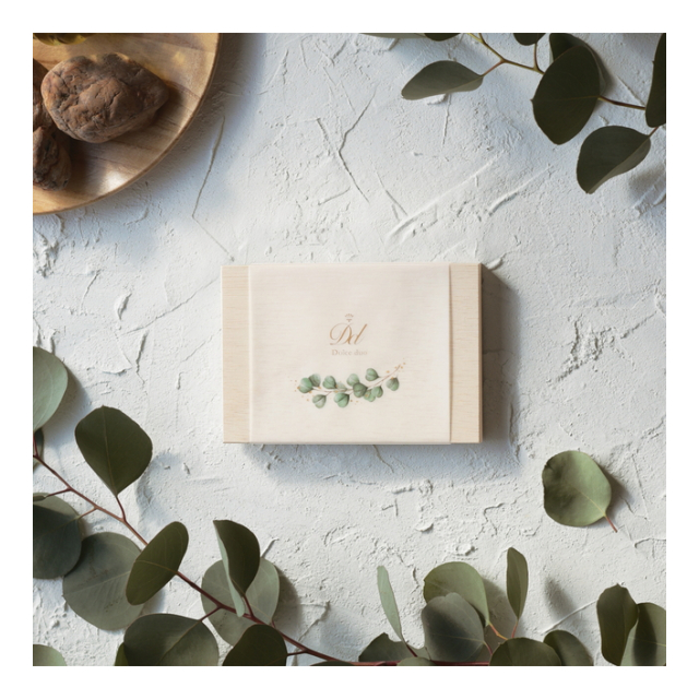 上品な木箱入りで大切な方への贈り物におすすめです。木の温もりをユーカリのナチュラルなモチーフが引き立てます。